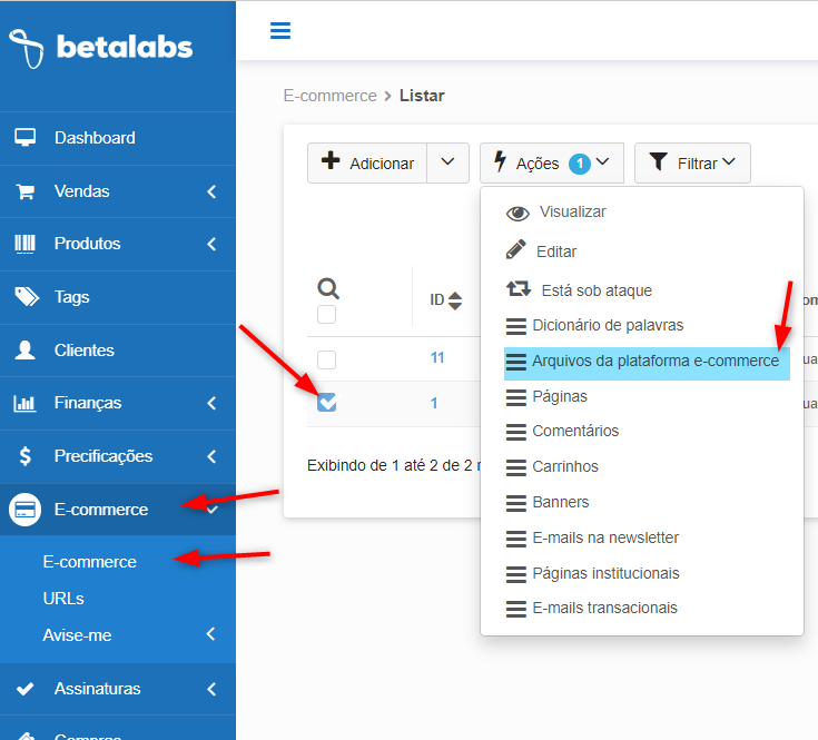 Selecione a loja desejada no box de marcação e clique em Ações > Arquivos da plataforma e-commerce.