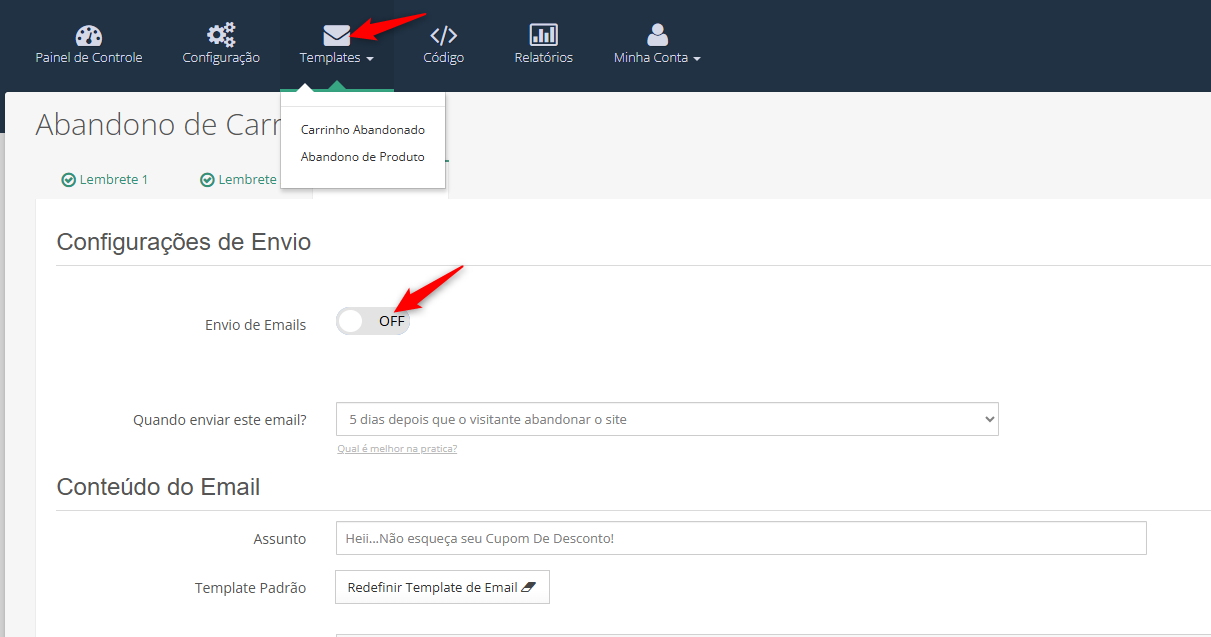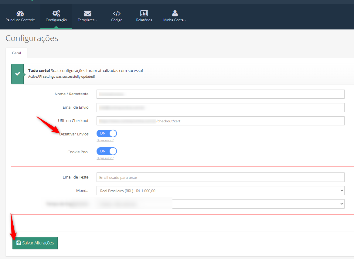 Para desativar todos os envios de e-mails da CartStack, acesse o painel e vá até Configurações. Em seguida, ative a opção "Desativar Envios" e salve as alterações.