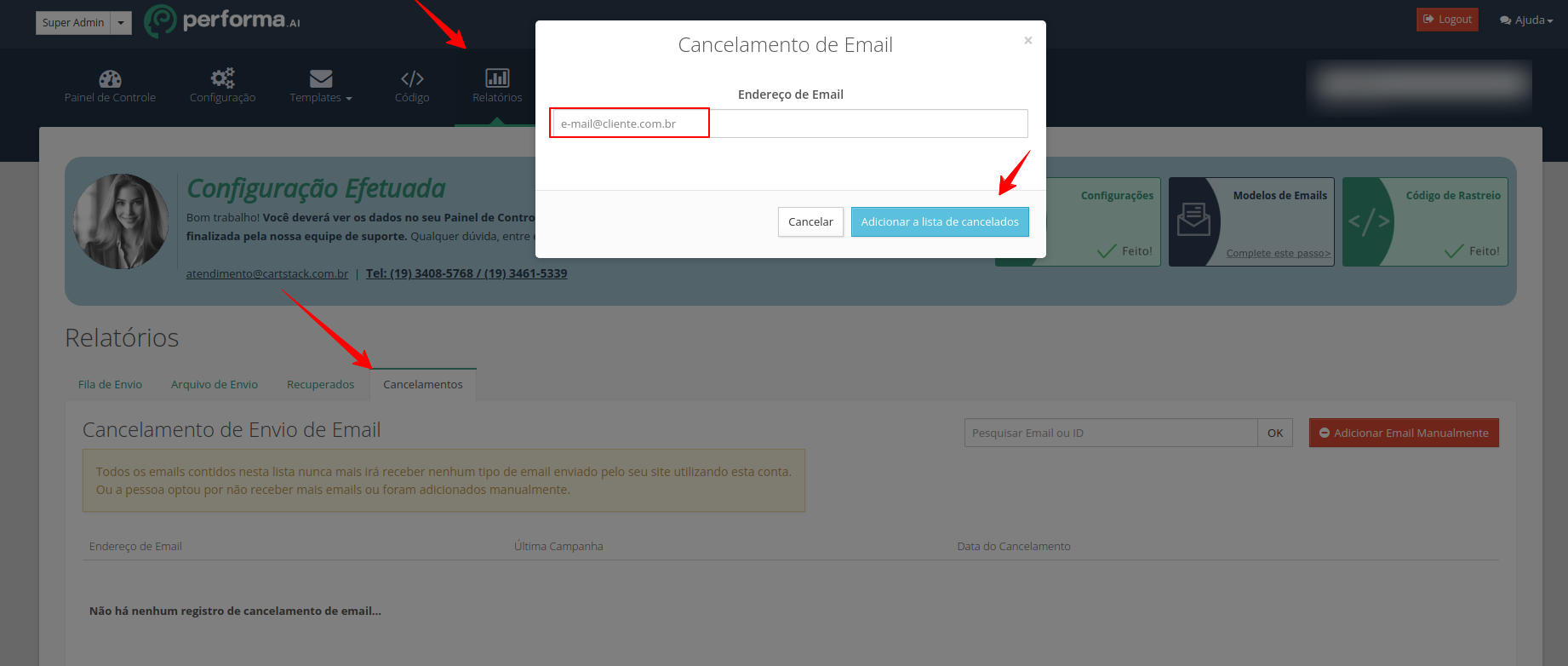 - Digite o e-mail que você deseja interromper os envios no campo indicado e clique em Adicionar a lista de cancelados.