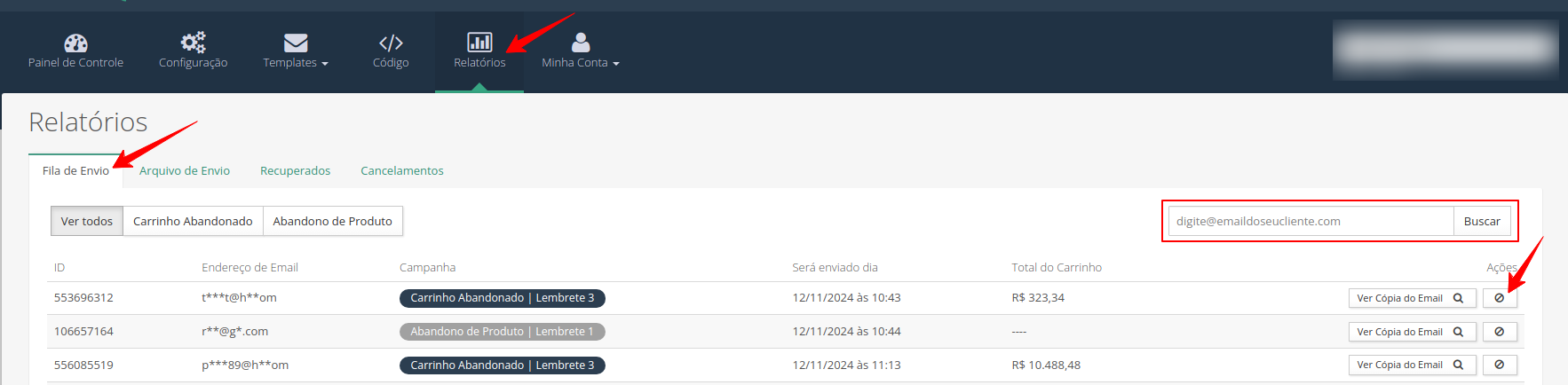 - Acesse o Painel do CartStack e vá até o menu Relatórios > Fila de Envio.