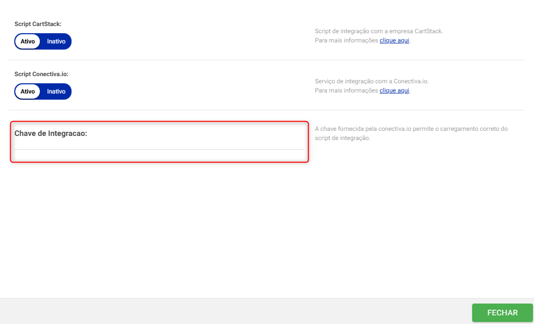 - Cole o token copiado anteriormente no campo "Chave de Integração".