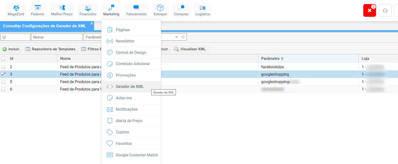 - Acesse o painel da plataforma > Marketing > Gerador de XML