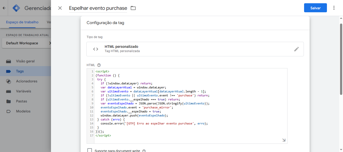 HTML – Espelhar evento purchaseTipo de tag: Personalizar → HTML personalizado