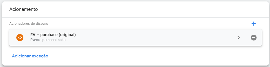 Em Acionamento, selecione o acionador “EV – purchase (original)” criado anteriormente