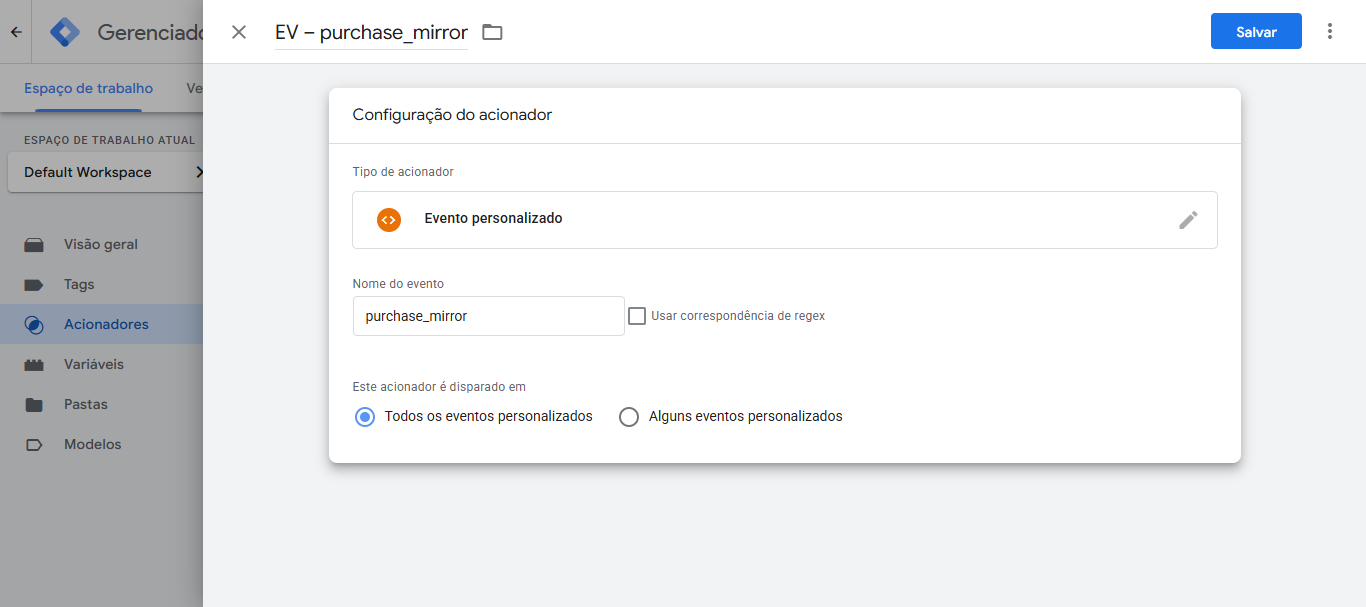 EV – purchase_mirrorTipo de acionador: Outros → Evento personalizado